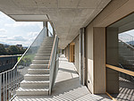 Die Laubengänge mit den ungewöhnlichen Baumstützen durften aus ästhetischen Gründen keine Querwände zur Aussteifung erhalten. Somit sind diese Bauwerke allein ausgesteift durch das kammartige Zusammenarbeiten der individuellen Baumstützen mit den darin eingespannten Laubengangdecken und den hausseitig vorhandenen Zug- und Druckstützen. Die Baumstützen waren für uns Neuland, deren Herstellung und Fixierung erarbeiteten wir in intensiver Zusammenarbeit mit Müller-Steinag Element AG und Peikko.